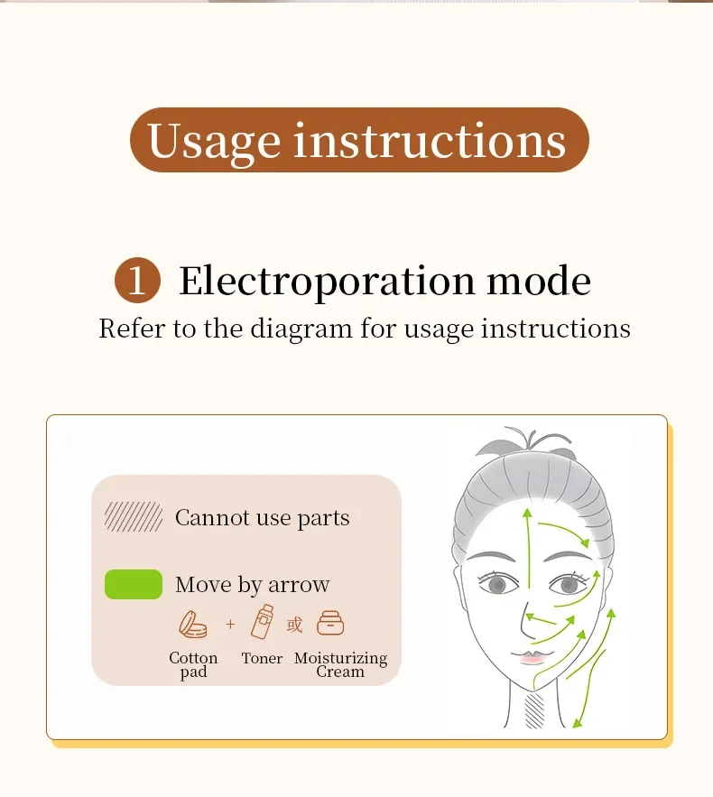 How to use the mesotherapy machine: Connect the USB cable to the power supply and the stand. Install the anti-aging machine on the base for charging. Clean your face and apply the skin care essence evenly. ③Press the power button to turn it on. Press the power button to increase the intensity (recommend with a low level). Press it 6 times to turn it off. Press LED SEL to set 6 colour modes. ④ When using, touch metal strips on both sides to achieve the best effect of EMS. ⑤Use it 10-20 minutes per time and 2-3 times a week