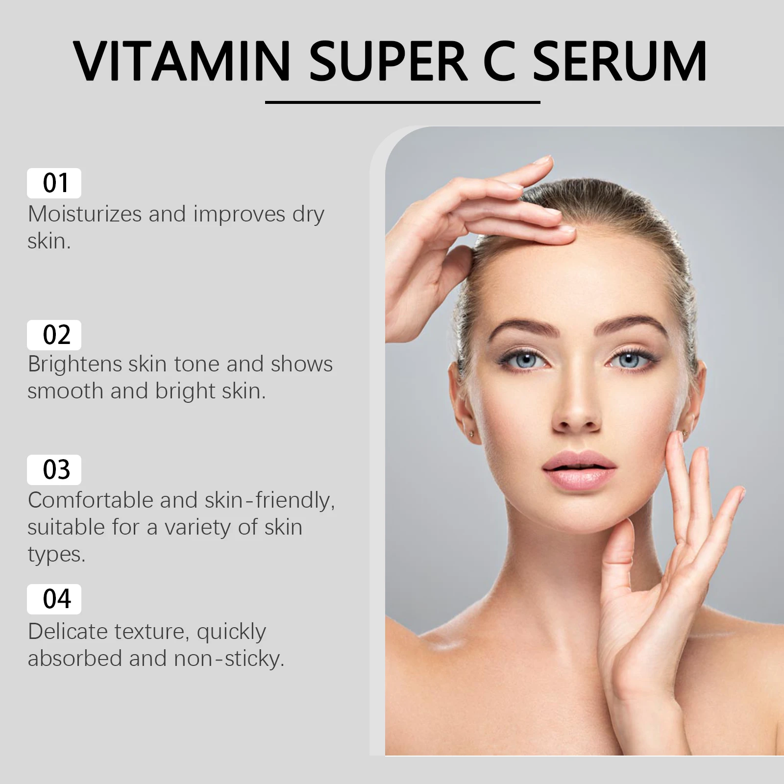1.Vitamin c helps to fight against the effects of free radical damage, support skin's natural collagen, and improve the look of skin tone, dark spots, dark circles, and fine lines & wrinkles for a glowing, brighter-looking complexion2.Experience deep hydration with our facial serum, replenishing moisture for a plump and hydrated complexion. Say goodbye to dryness and hello to a radiant glow!